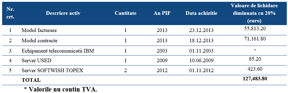 V.F. INSOLVENŢĂ SPRL, in calitate de lichidator judiciar al societatii debitoare NECC TELECOM ROMANIA S.A. – „in faliment, in bankruptcy, en faillite”, organizeaza licitație publica cu strigare in data de 03.07.2024, ora 11.00 pentru valorificarea in bloc a activelor imobilizate (mijloace fixe) apartinand societatii debitoare, situate la sediul Centrului de afaceri Lumina Verde din Municipiul Ploiesti, Str. Elipsei, Nr. 1, judetul Prahova, descrise in anexa la prezenta. Licitatia se va desfasura în sistem electronic, prin intermediul platformei UNPIR de licitații online care poate fi accesată la adresa: https://www.licitatii-unpir.ro/office/it/mijloace-fixe-module-si-servere/, pretul de pornire fiind de 127.483,80 Euro la care se adauga TVA conform prevederilor legale incidente la data transferului dreptului de proprietate. In situatia in care activele nu se valorifica la prima licitatie publica cu strigare, se vor organiza in continuare alte 3 (trei) sedinte de licitatii publice, in aceleasi conditii de pret si la aceeasi ora, avand ca pret de pornire valoarea de lichidare stabilita prin raportul de evaluare, diminuata cu 20%, in urmatoarele date: 10.07.2024, 17.07.2024 si 24.07.2024. Informatii suplimentare privind descrierea activului, conditiile de participare si organizarea licitatiilor puteti solicita prin intermediul platformei.