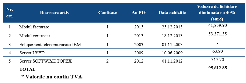 10.01.2025: V.F. INSOLVENŢĂ SPRL, in calitate de lichidator judiciar al societatii debitoare NECC TELECOM ROMANIA S.A. – „in faliment, in bankruptcy, en faillite”, organizeaza licitație publica cu strigare in data de 16.01.2025, ora 11.00 pentru valorificarea in bloc a activelor imobilizate (mijloace fixe) apartinand societatii debitoare, situate la sediul Centrului de afaceri Lumina Verde din Municipiul Ploiesti, Str. Elipsei, Nr. 1, judetul Prahova, descrise in anexa la prezenta. Licitatia se va desfasura în sistem electronic, prin intermediul platformei UNPIR de licitații online care poate fi accesată la adresa: https://www.licitatii-unpir.ro/office/it/mijloace-fixe-module-si-servere/, pretul de pornire fiind de 95.612,85 Euro la care se adauga TVA conform prevederilor legale incidente la data transferului dreptului de proprietate. In situatia in care activele nu se valorifica la prima licitatie publica cu strigare, se vor organiza in continuare alte 3 (trei) sedinte de licitatii publice, in aceleasi conditii de pret si la aceeasi ora, avand ca pret de pornire valoarea de lichidare stabilita prin raportul de evaluare, diminuata cu 40%, in urmatoarele date: 23.01.2025, 30.01.2025 si 06.02.2025. Informatii suplimentare privind descrierea activului, conditiile de participare si organizarea licitatiilor puteti solicita prin intermediul platformei.