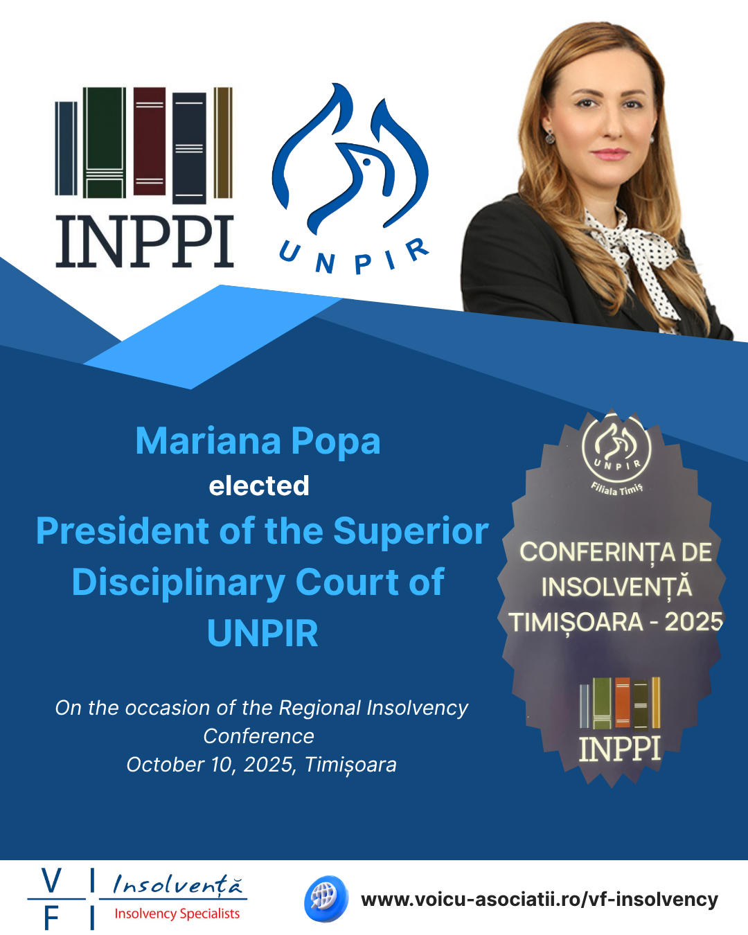 ▶️ Alegerile au avut loc vineri, 10 octombrie 2025, la Timișoara, în cadrul Conferinței Regionale de Insolvență organizate de Filiala Timiș a UNPIR și INPPI. Evenimentul a reunit profesioniști de top din domeniile insolvenței, dreptului comercial și fiscalității, oferind o platformă pentru schimbul de idei, analiza tendințelor recente și dezbaterea provocărilor actuale din practică.